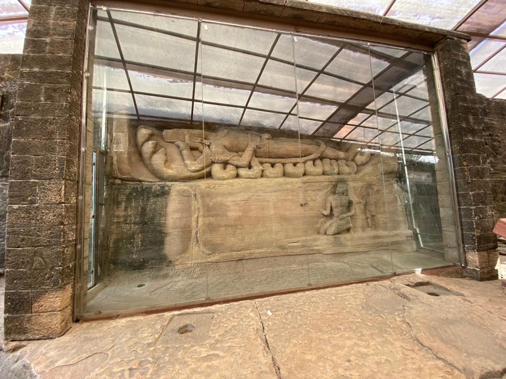 While most of the sculptures are hidden inside small caves that you can peek into from outside, there are a few with spectacular sculptures that you can admire up close. One such cave is Cave #5 which has a large sculpture depicting Lord Vishnu in his boar (Varaha) avatar. Interestingly, this is one of the few caves that can be seen from the road as well. So, if you have anyone who is physically not able to climb stairs, you can ask the driver to stop near this cave and you can admire the carvings from outside the fence as well.