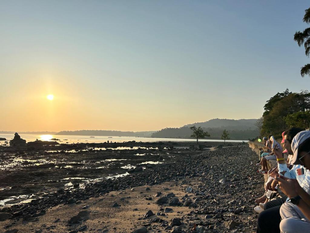 Second Leg – We returned to Sri Vijaya Puram (Port Blair) after visiting Swaraj Dweep and Shaheed Dweep. It was close to 3 pm by the time we reached our hotel. We had a late lunch and then headed to Chidiya Tapu to watch the sunset. We were a bit exhausted by this time so we decided to skip Munda Pahar beach and view point (the road was undergoing repairs at the time and it just did not seem like a smooth ride there) and went to Chidiya Tapu instead. It was low tide and once again, a wide stretch of mucky beach. While the sun was bright, many people ventured closer to the water but soon were asked to return to the sandy part of the beach. Most of us sat on the retaining wall and watched the beautiful sunset.